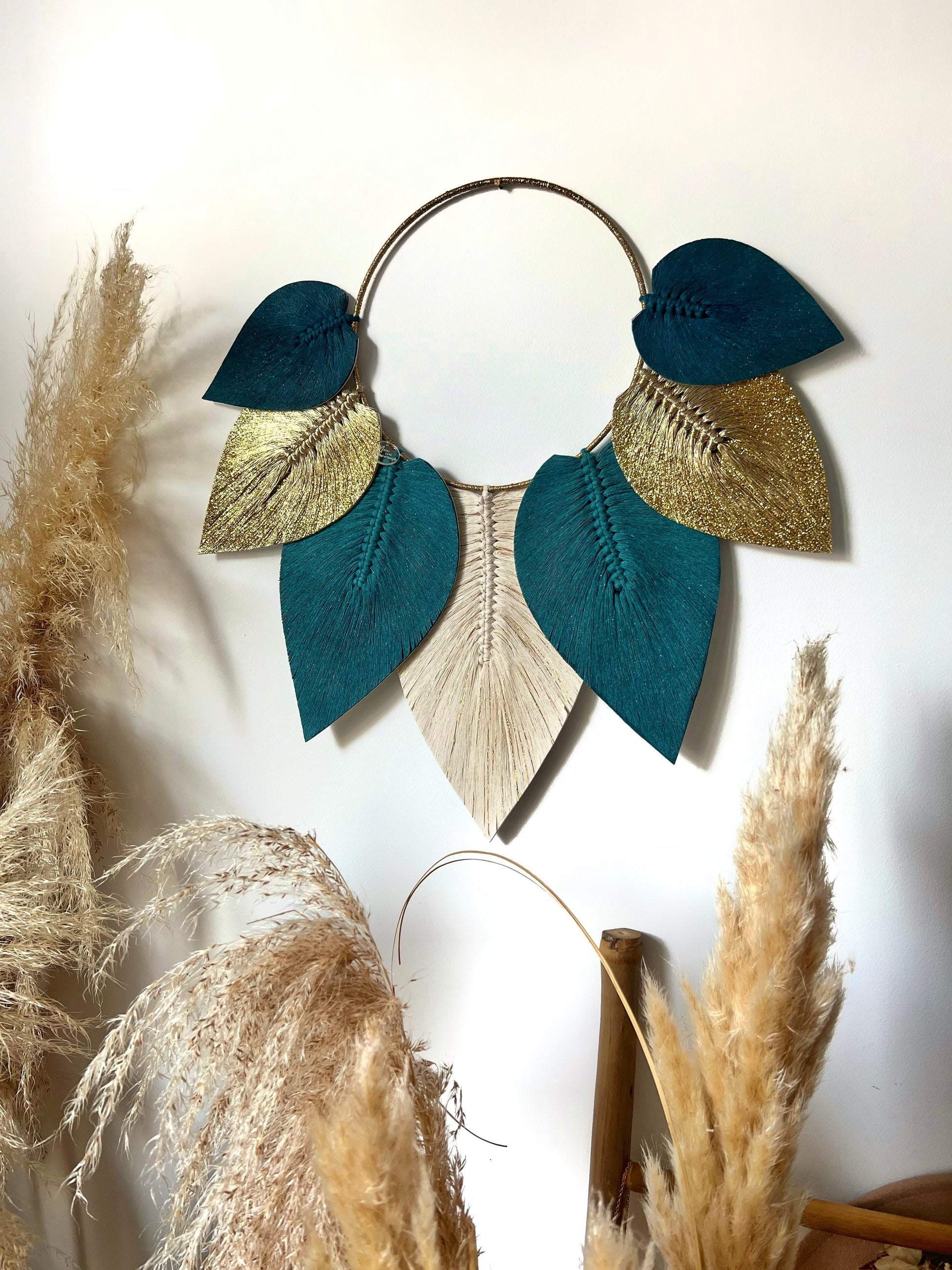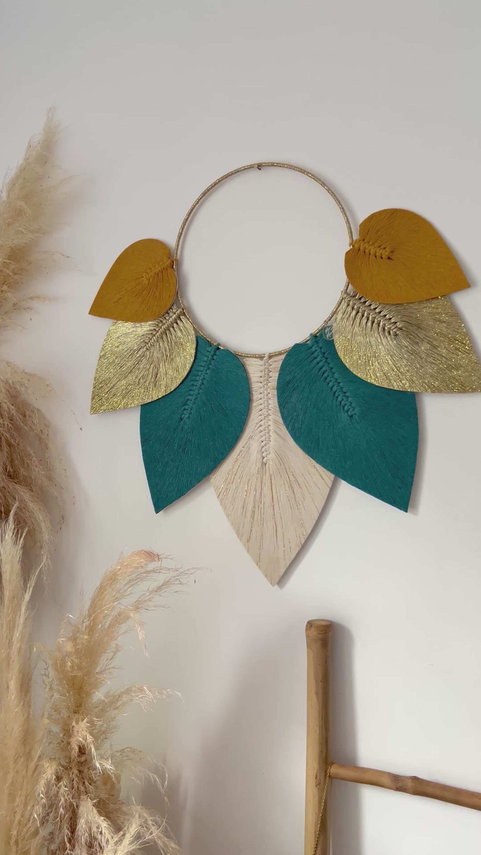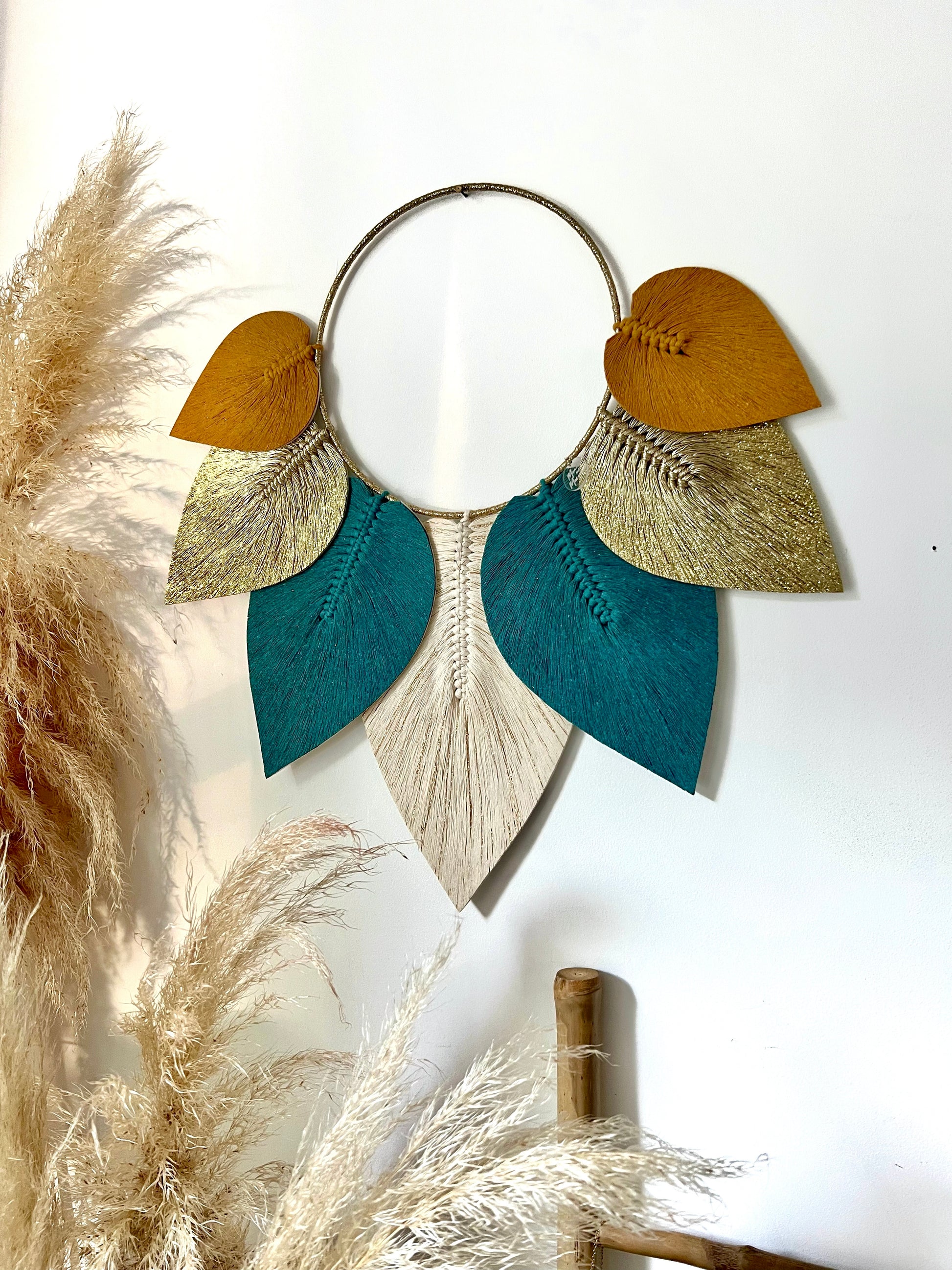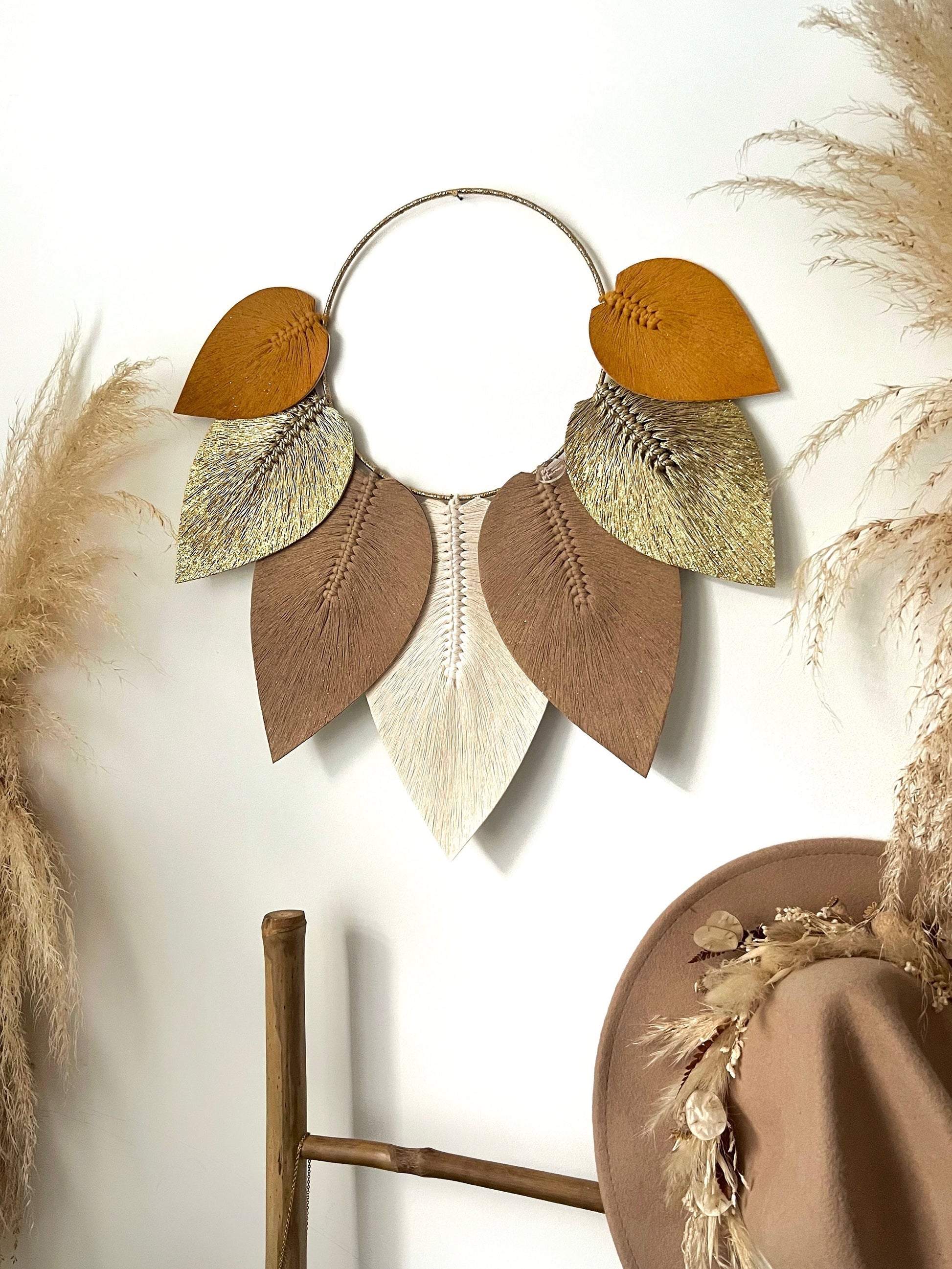 Son cercle finement habillé de fils dorés met en valeur un ensemble de plumes en macramé stabilisées, aux nuances subtiles & harmonieuses 🎨 Chaque plume semble suspendue dans l’air, apportant une sensation de douceur & de mouvement à votre décoration 🍁