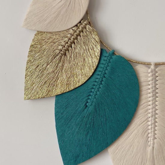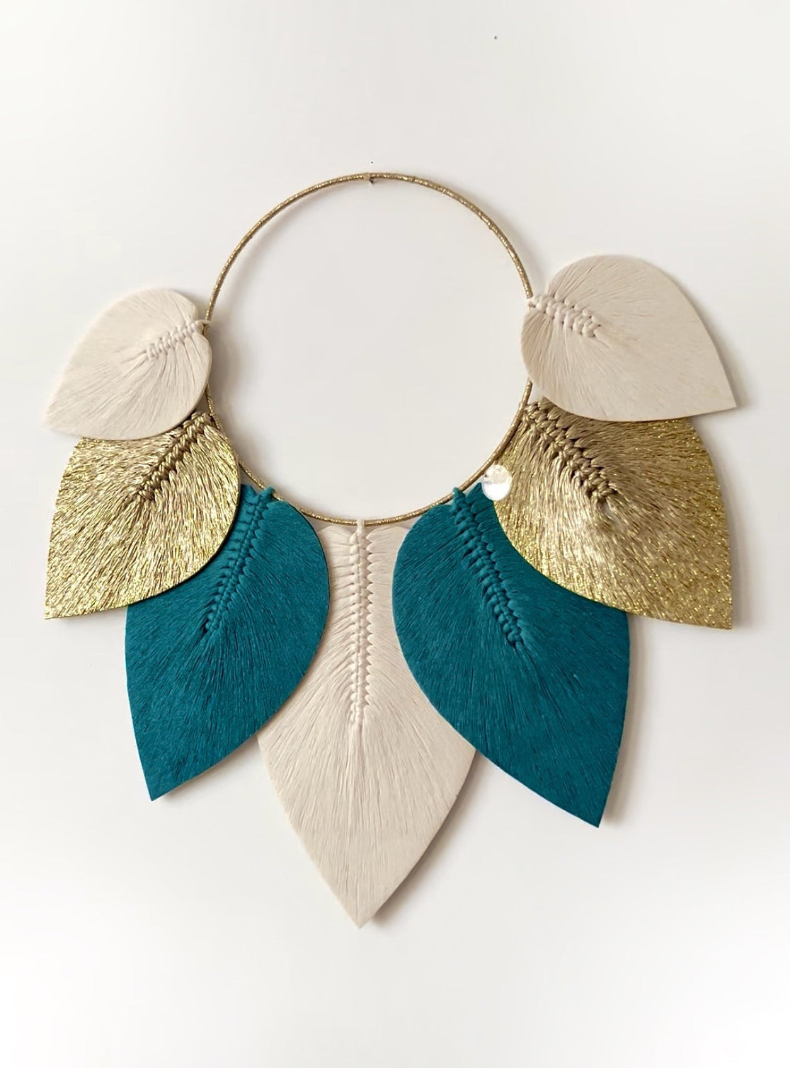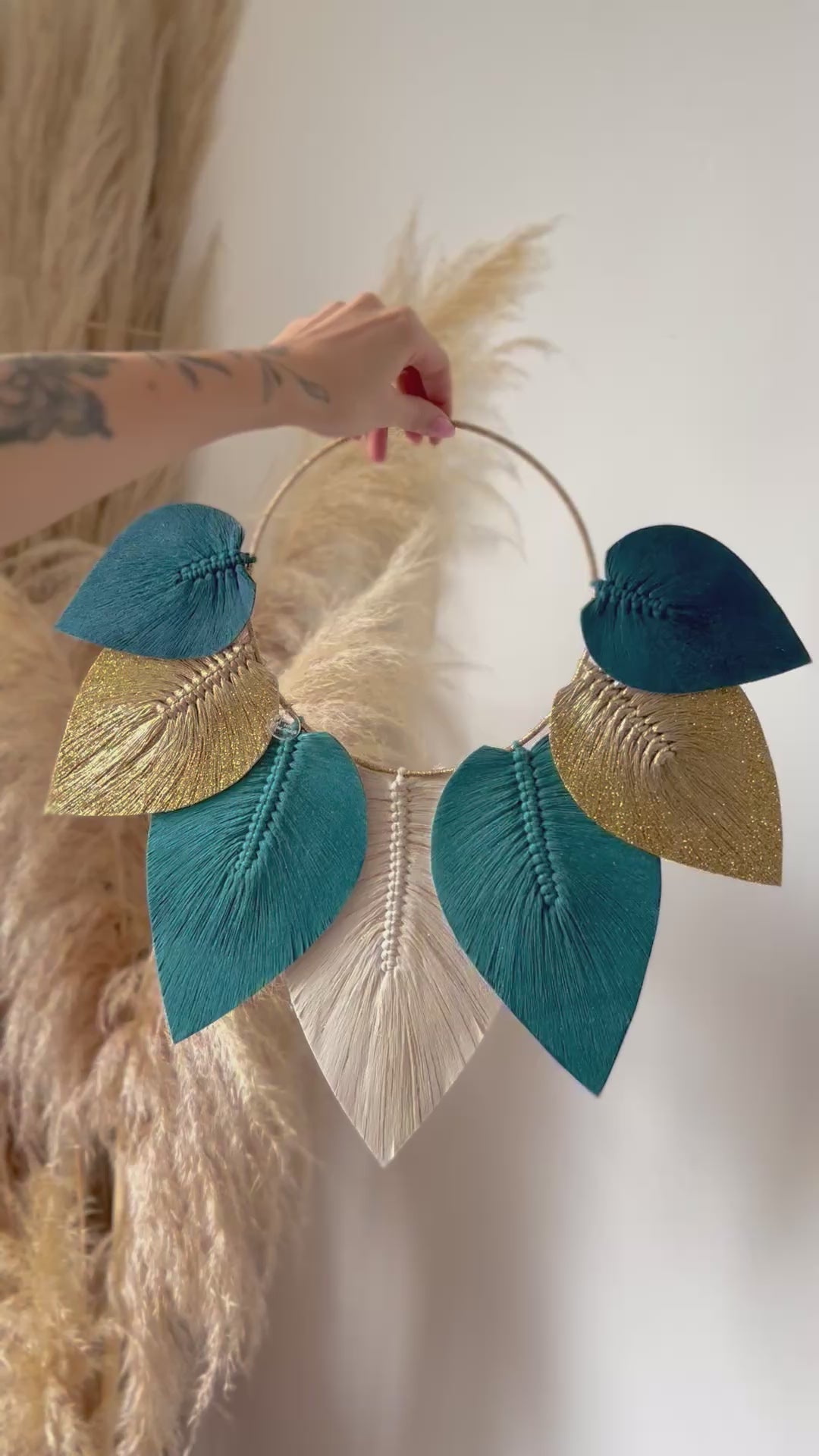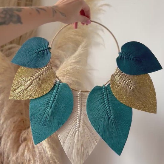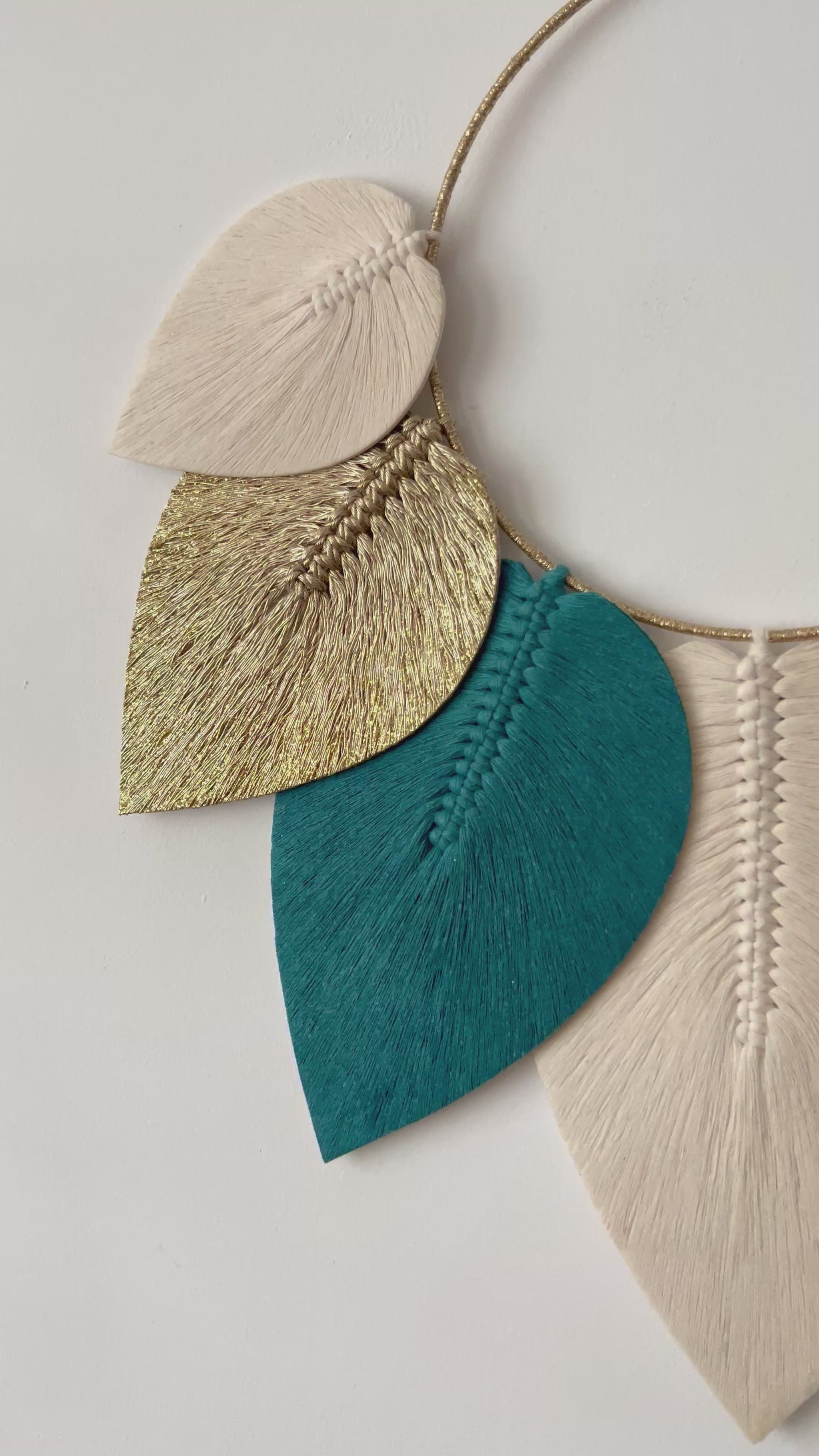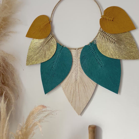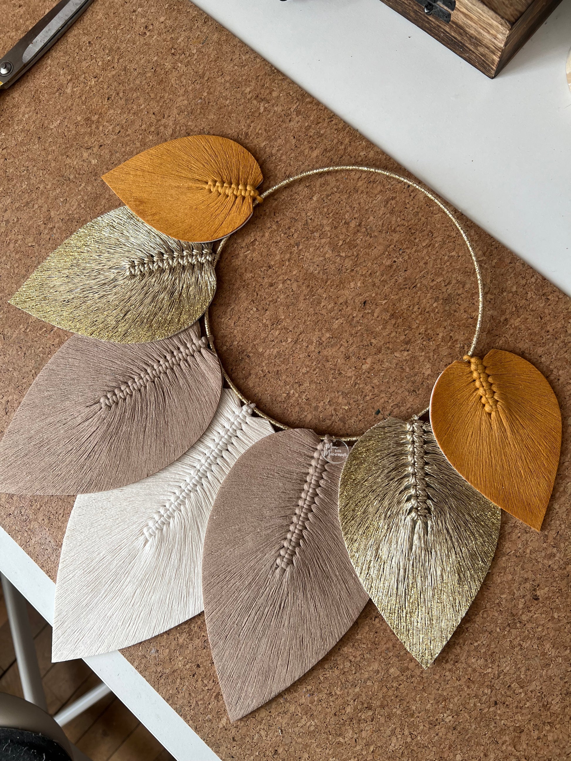 Son cercle finement habillé de fils dorés met en valeur un ensemble de plumes en macramé stabilisées, aux nuances subtiles & harmonieuses 🎨 Chaque plume semble suspendue dans l’air, apportant une sensation de douceur & de mouvement à votre décoration 🍁