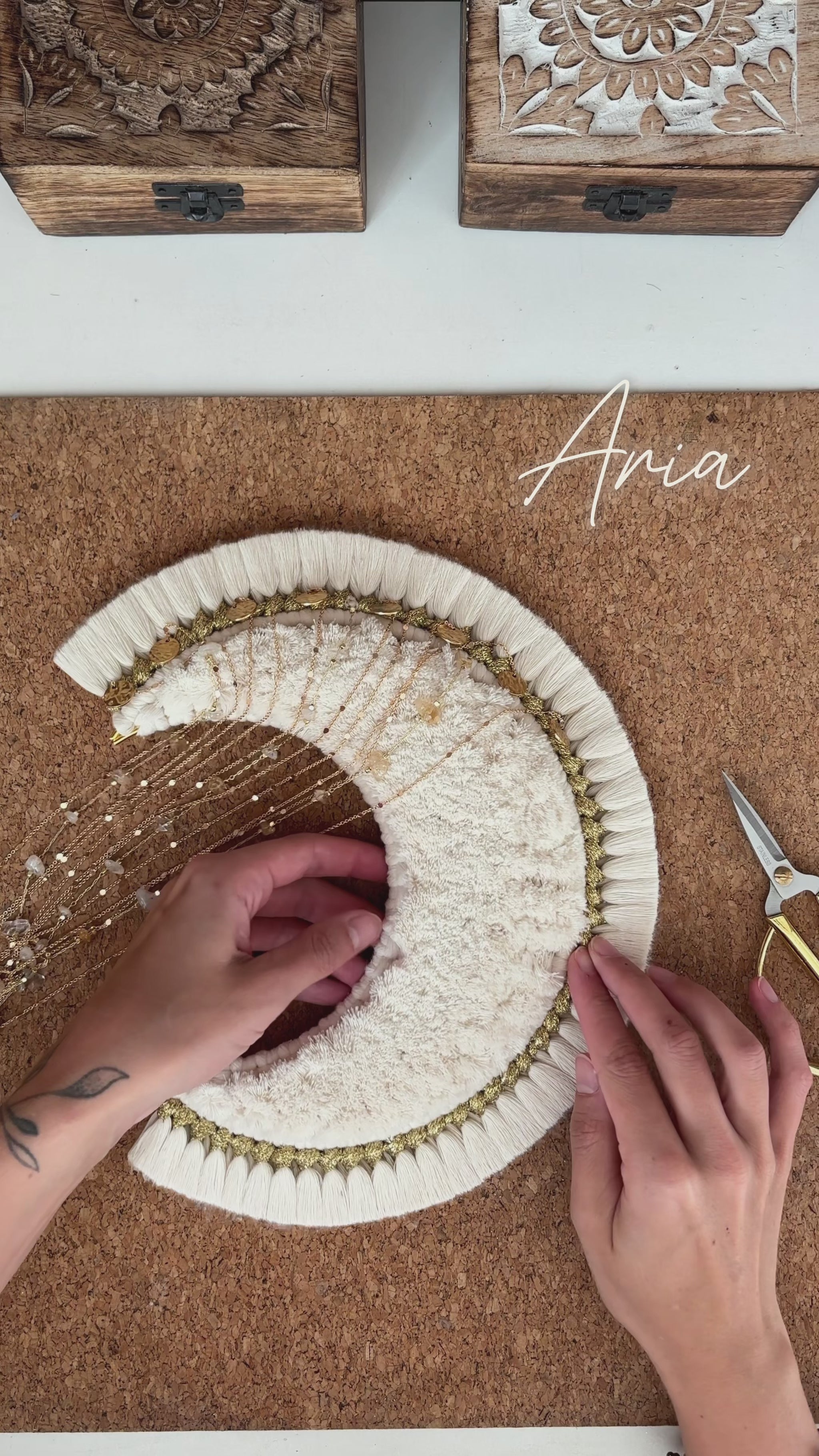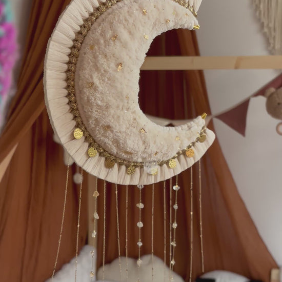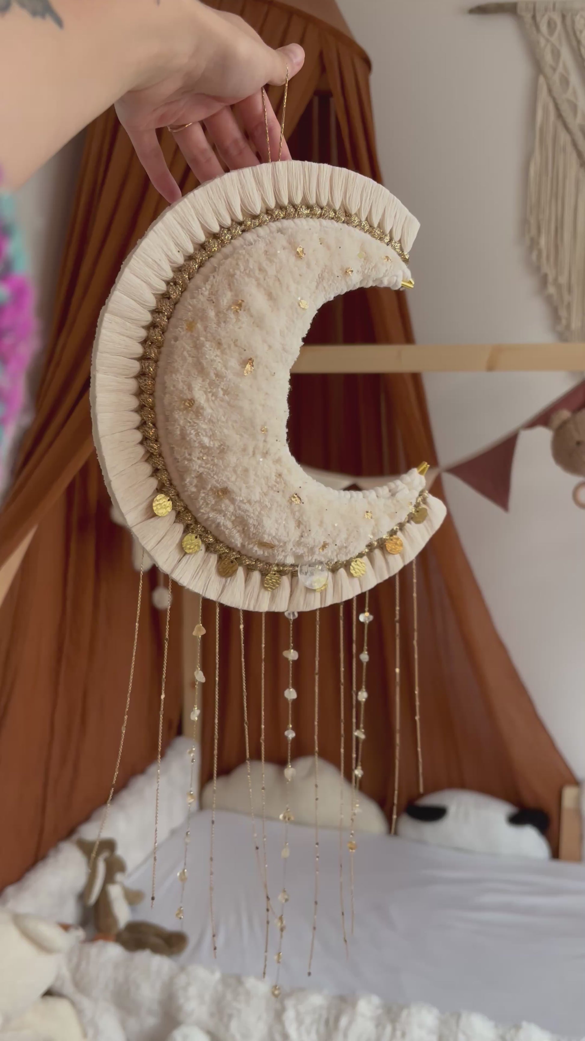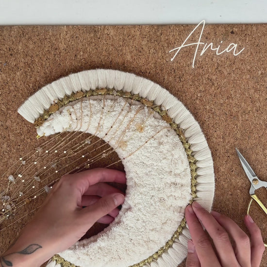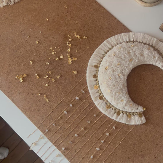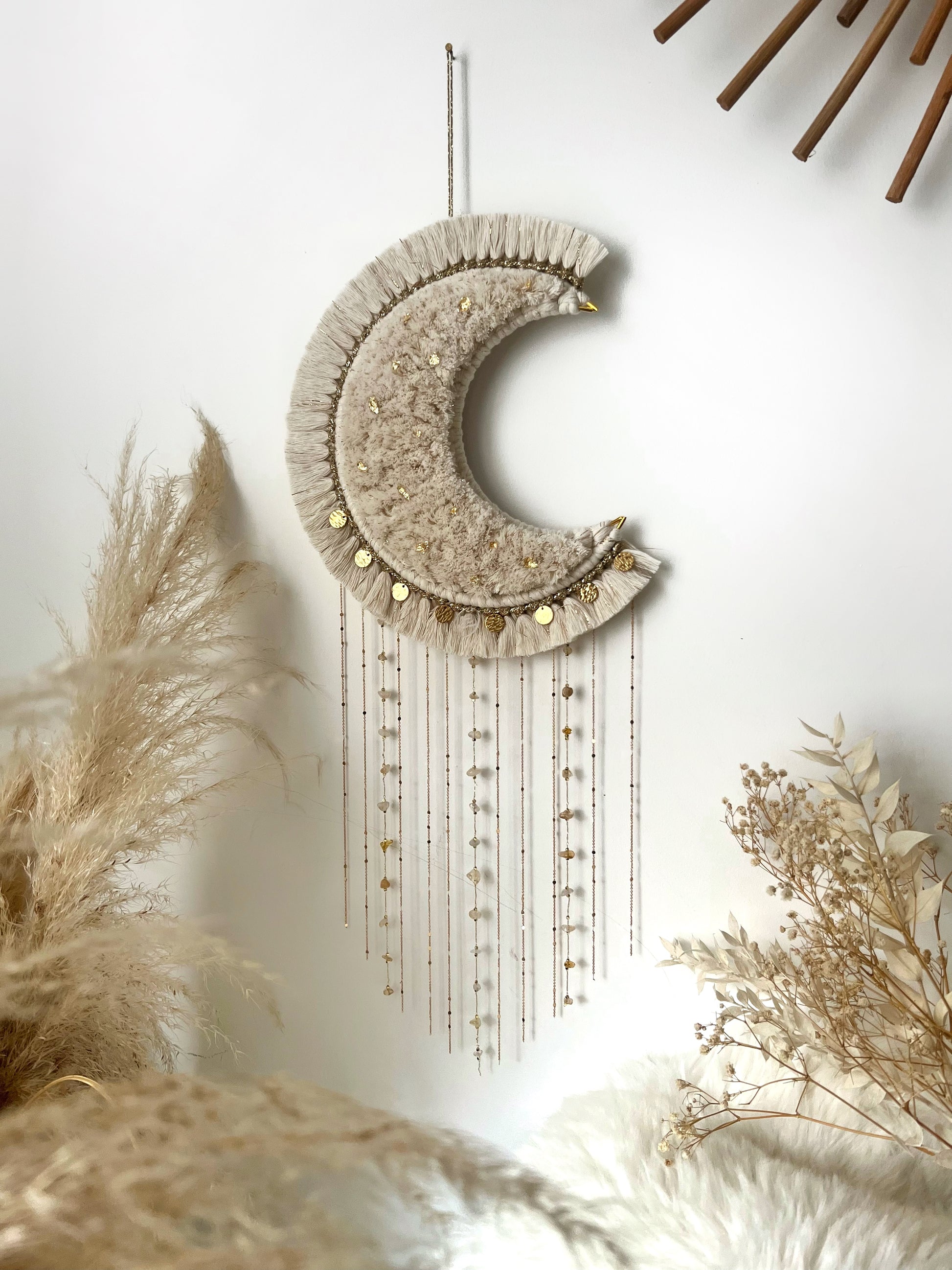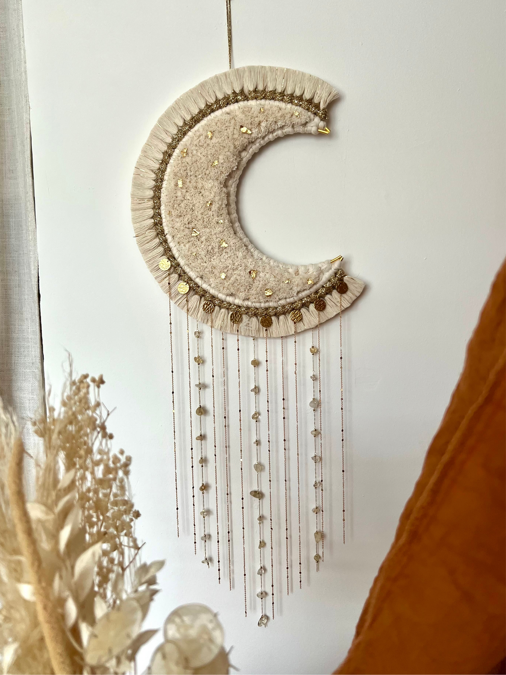 La grande lune Aria est une pièce maîtresse en macramé, façonnée à la main avec minutie & passion 💛 Sa forme en croissant de lune, rehaussée de pampilles dorée, de chaînettes, de véritables pierres, & d’éclats d’or diffuse une atmosphère bohème chic & poétique dans votre intérieur 🌙✨