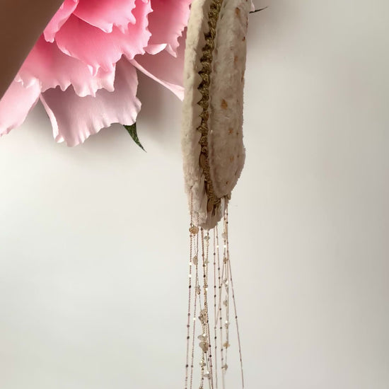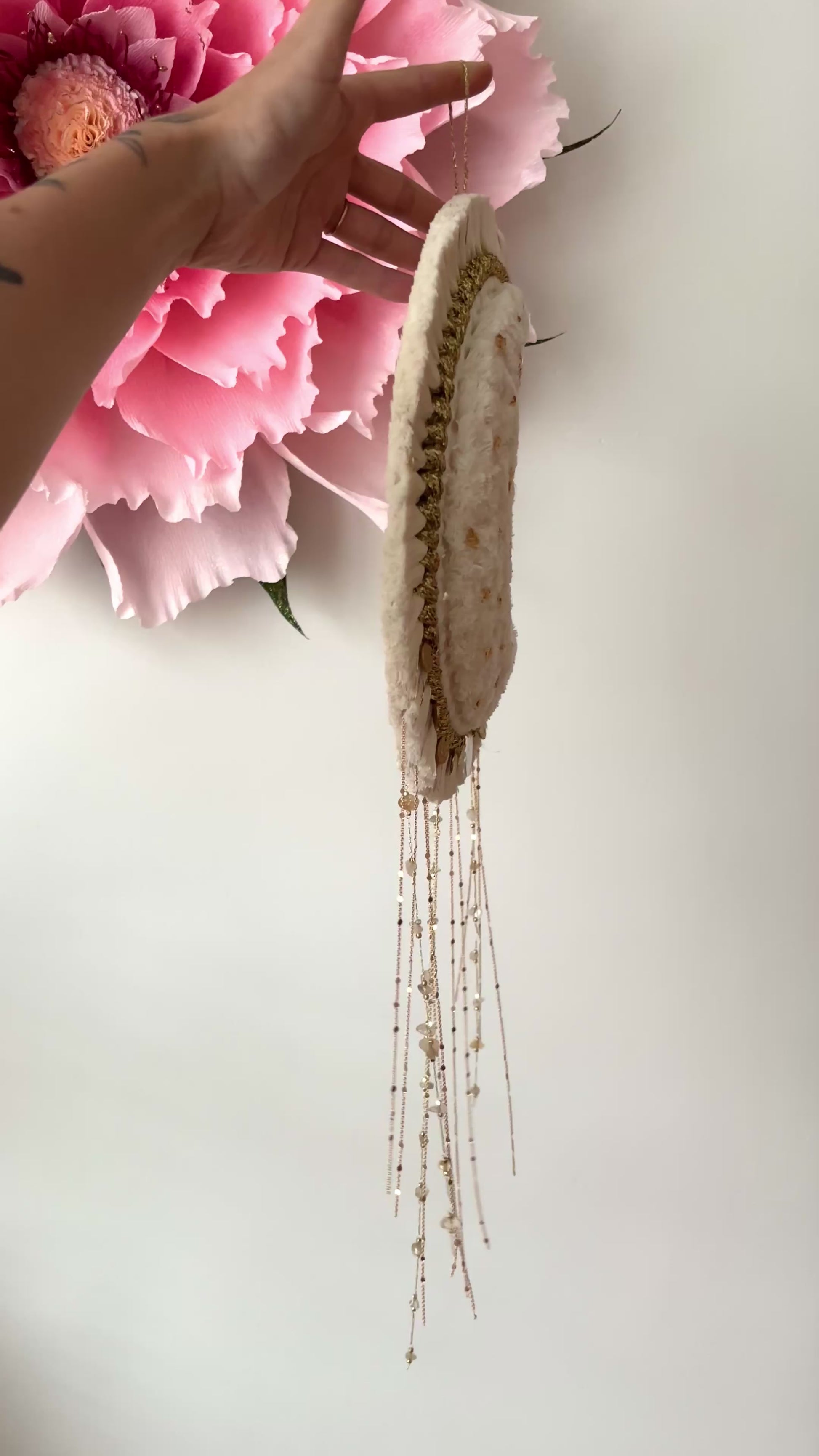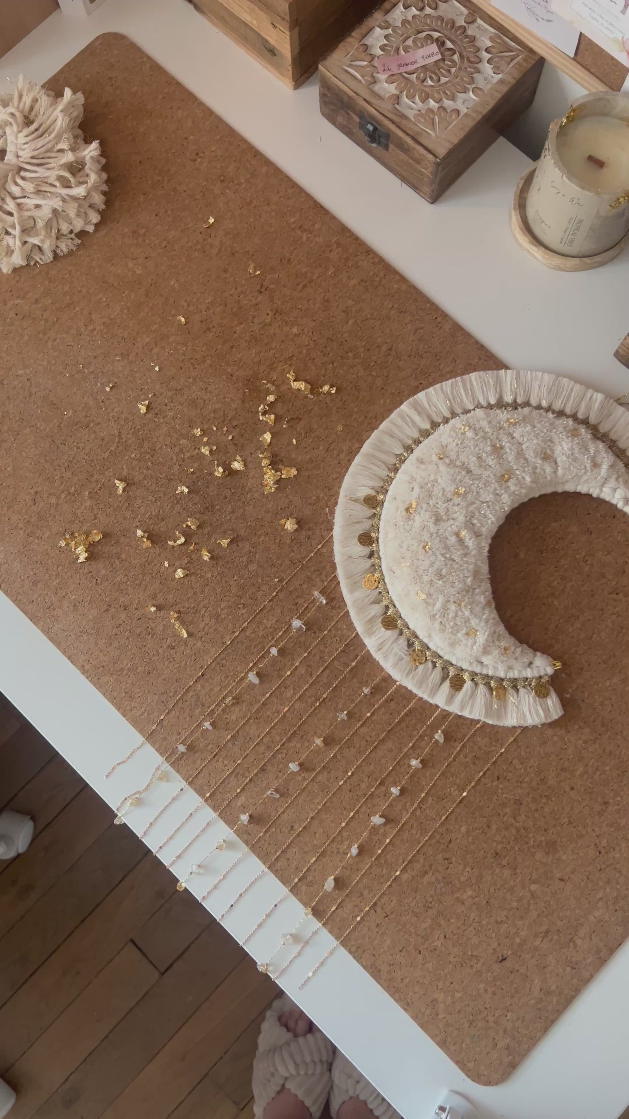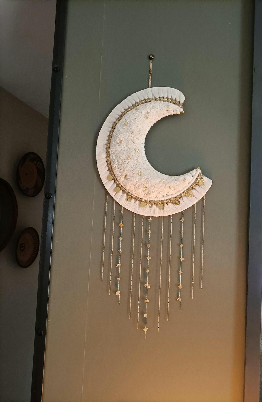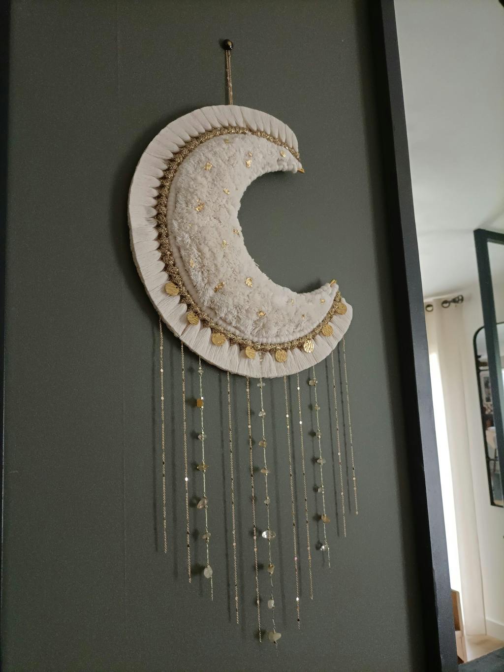 La grande lune Aria est une pièce maîtresse en macramé, façonnée à la main avec minutie & passion 💛 Sa forme en croissant de lune, rehaussée de pampilles dorée, de chaînettes, de véritables pierres, & d’éclats d’or diffuse une atmosphère bohème chic & poétique dans votre intérieur 🌙✨