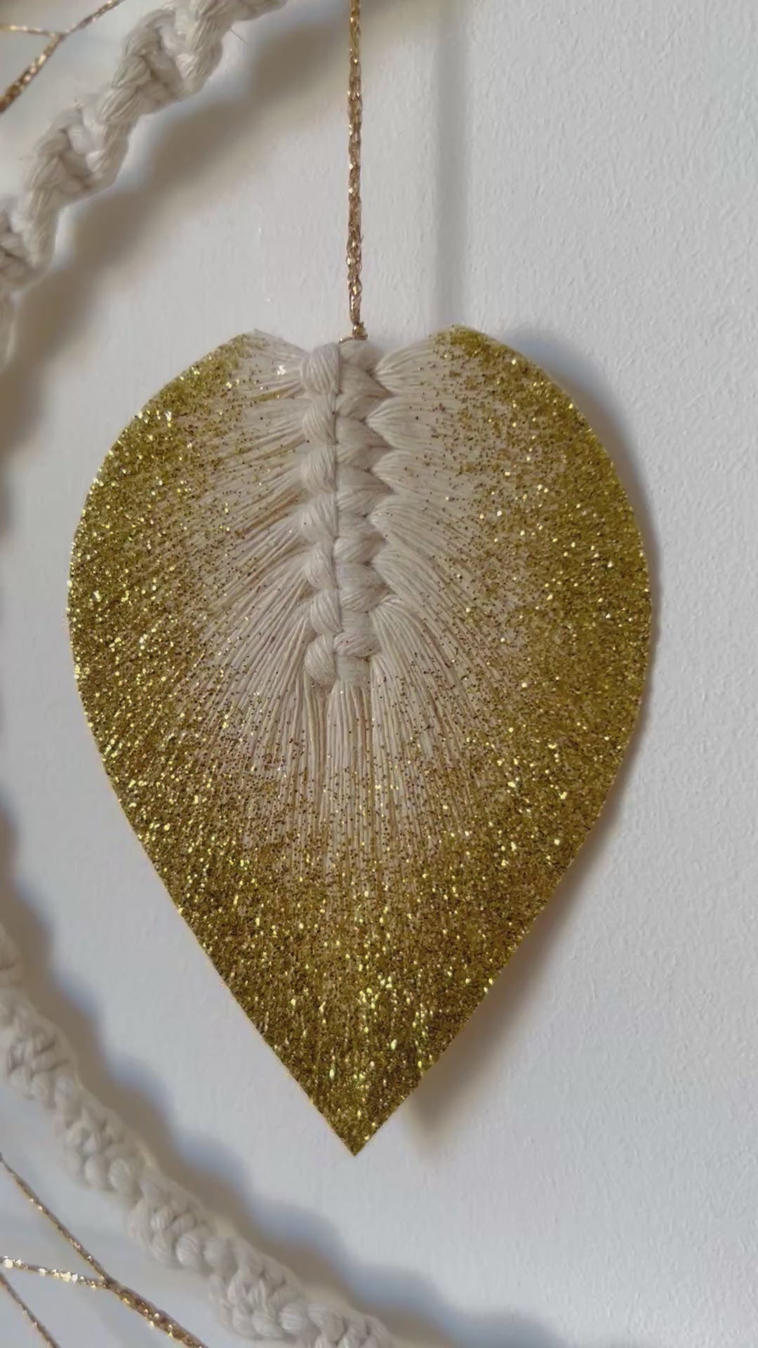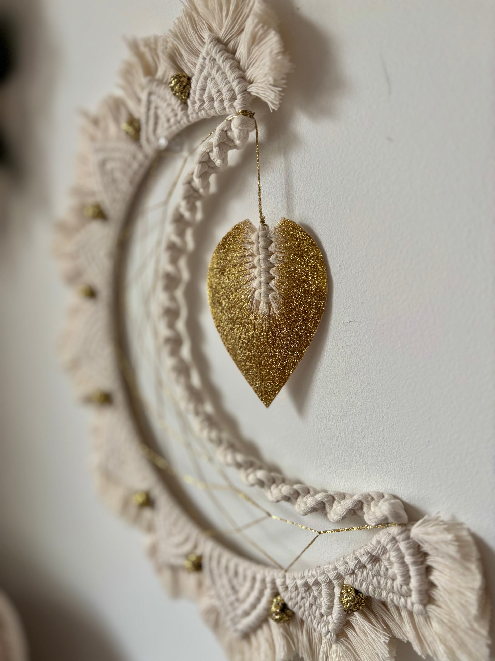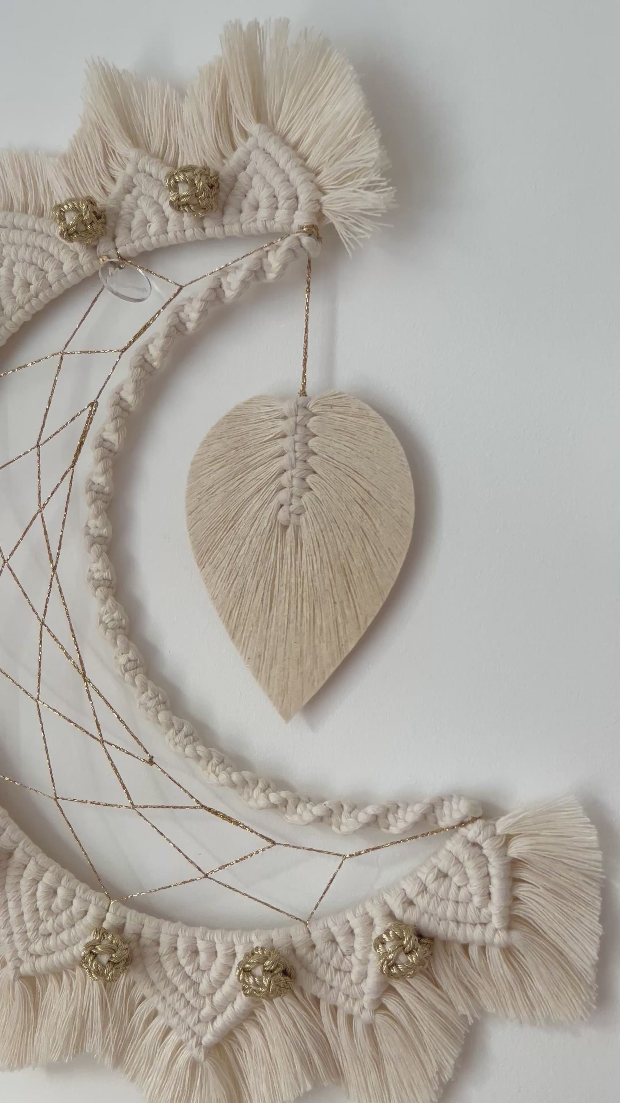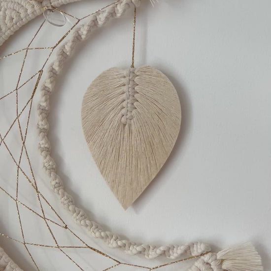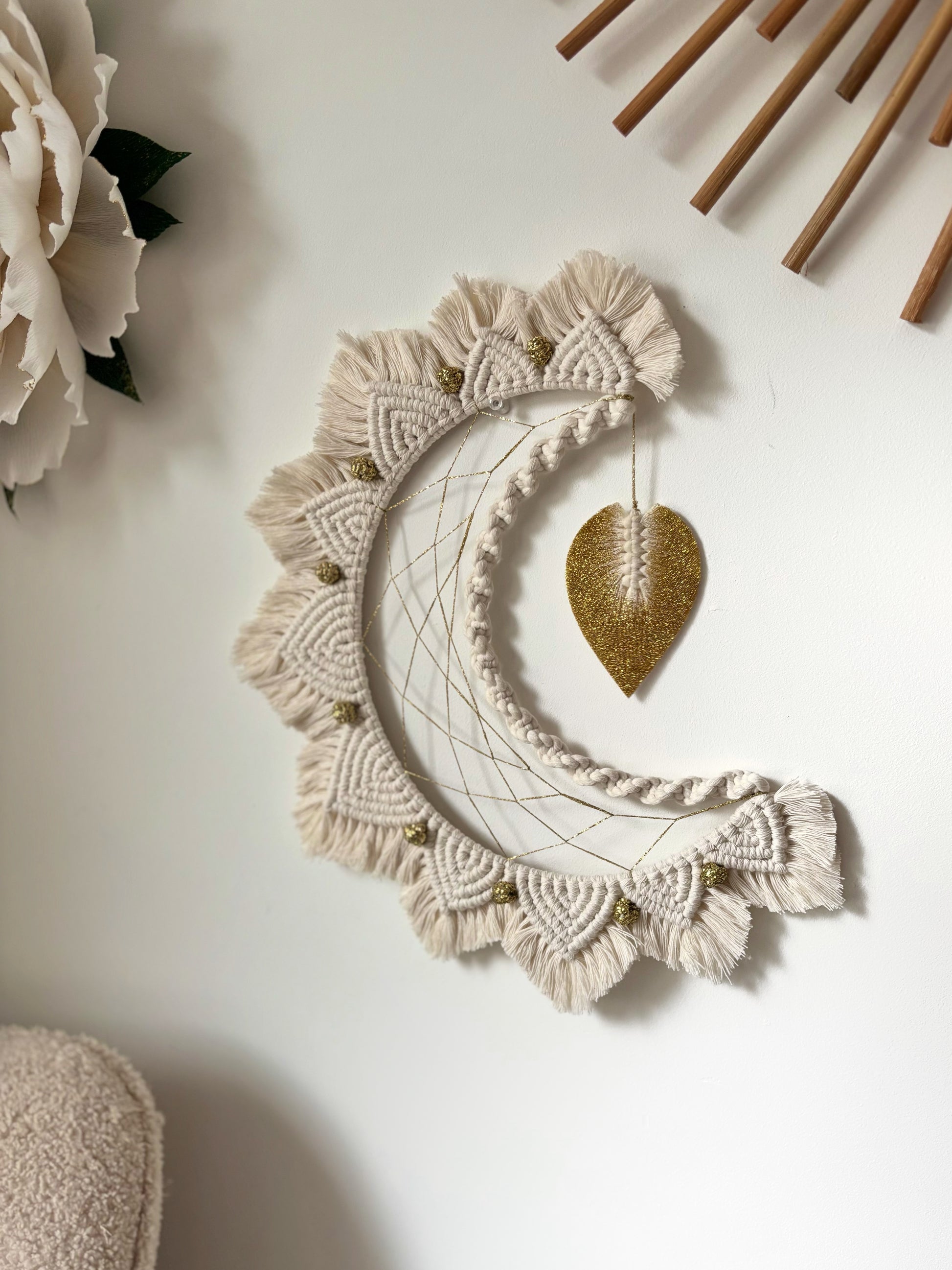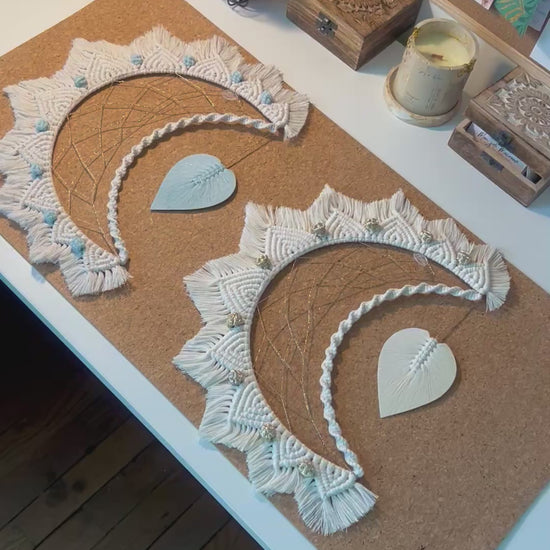 Cette lune en macramé, entièrement réalisée à la main, mêle douceur & élégance grâce à ses motifs mandala délicatement noués & ses petites touches dorées 🌙✨