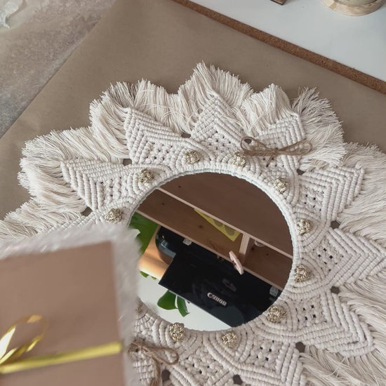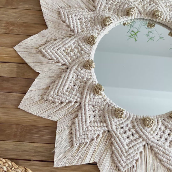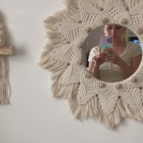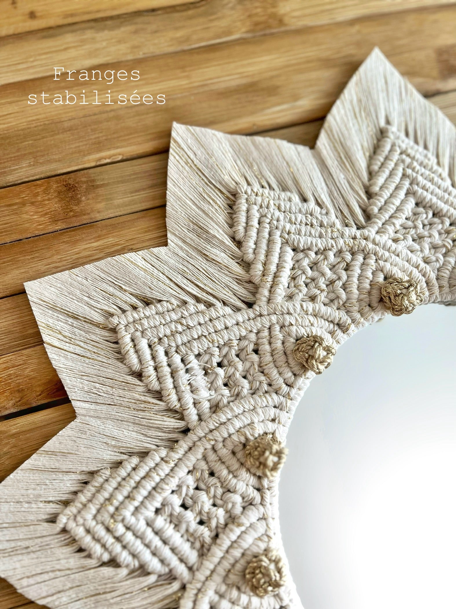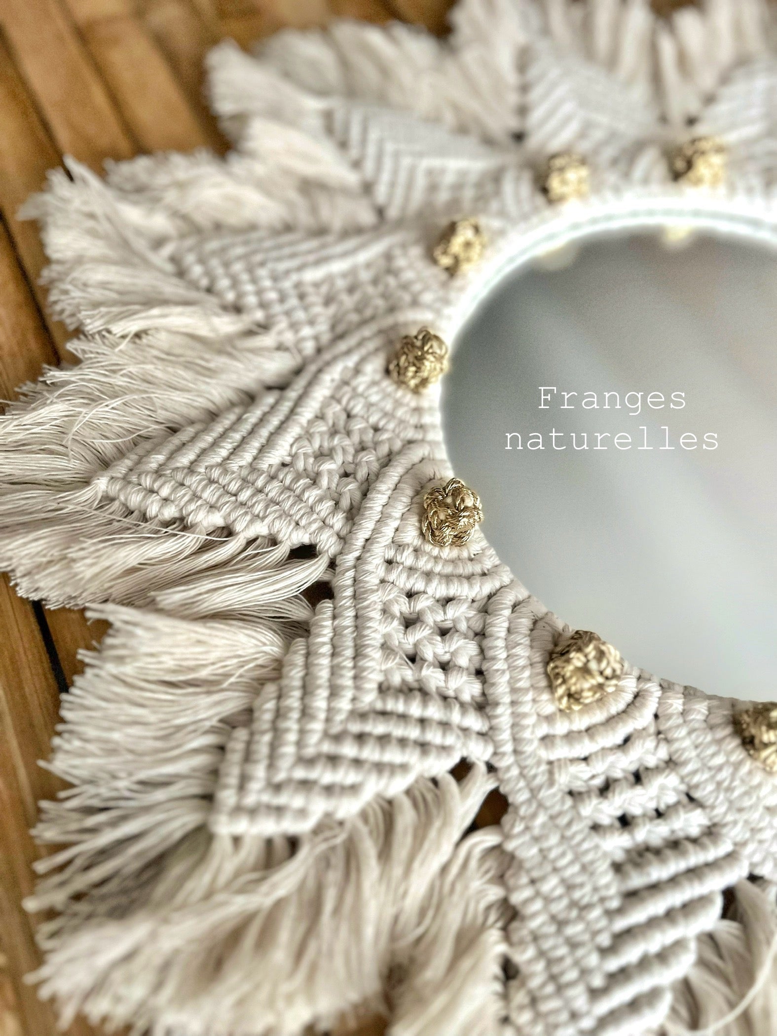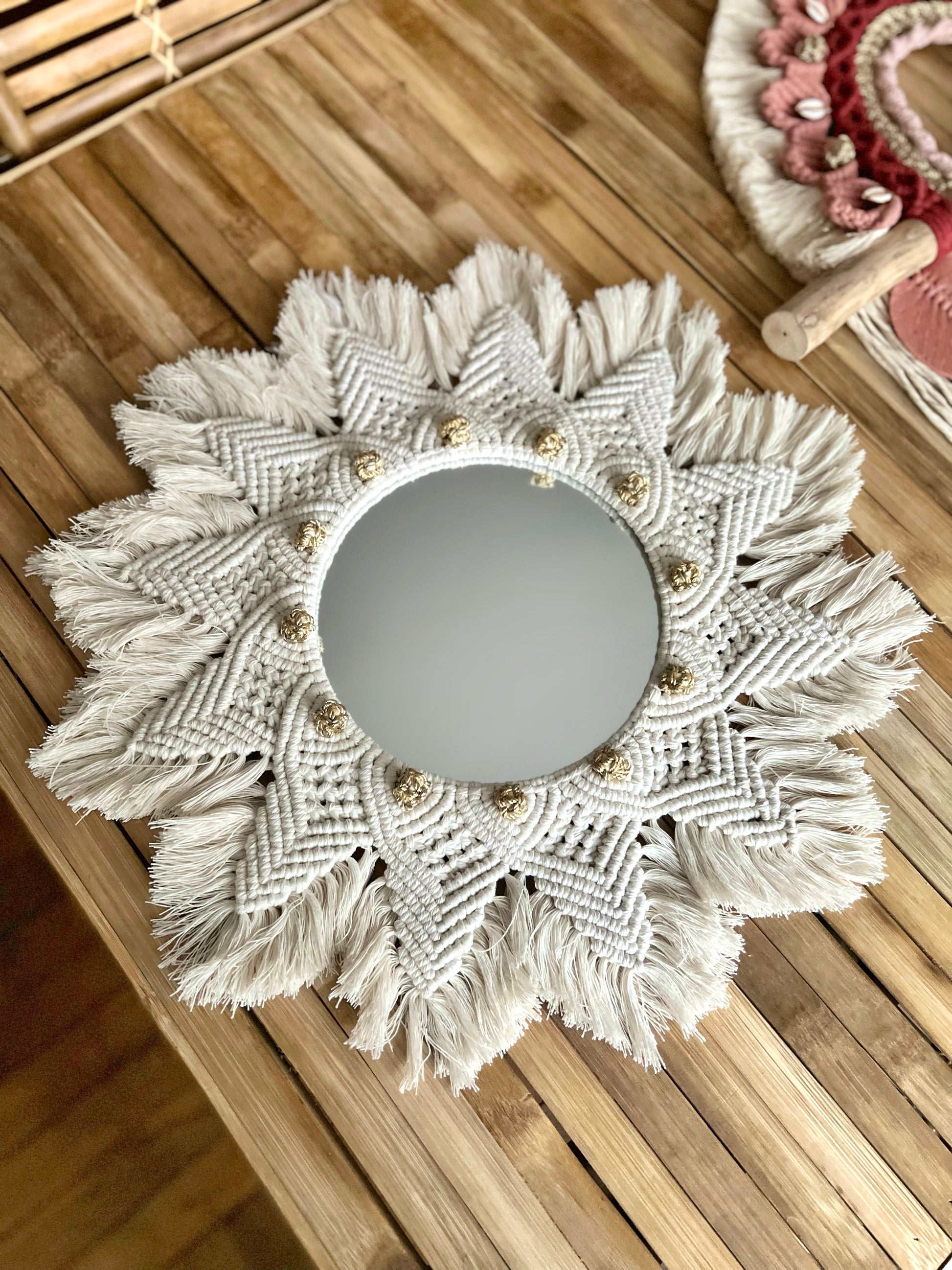Autour de son miroir central de 20 cm, un tressage délicat en macramé se déploie, rythmé de petites boules dorées tressées qui ajoutent une touche de lumière & d’élégance à l’ensemble 💡
