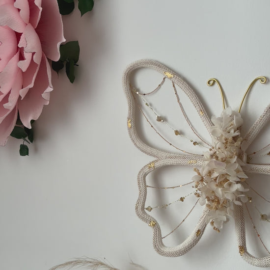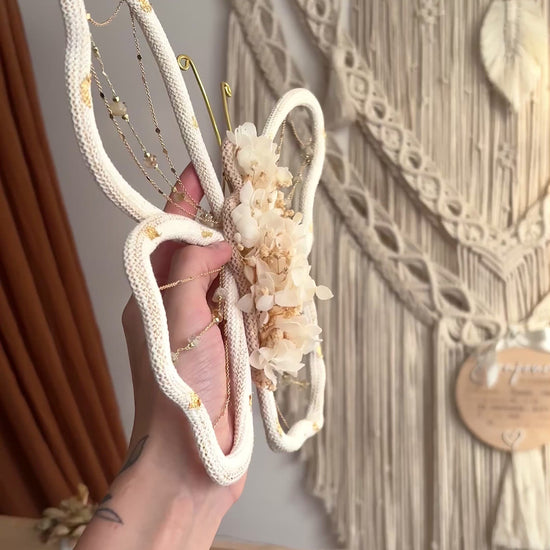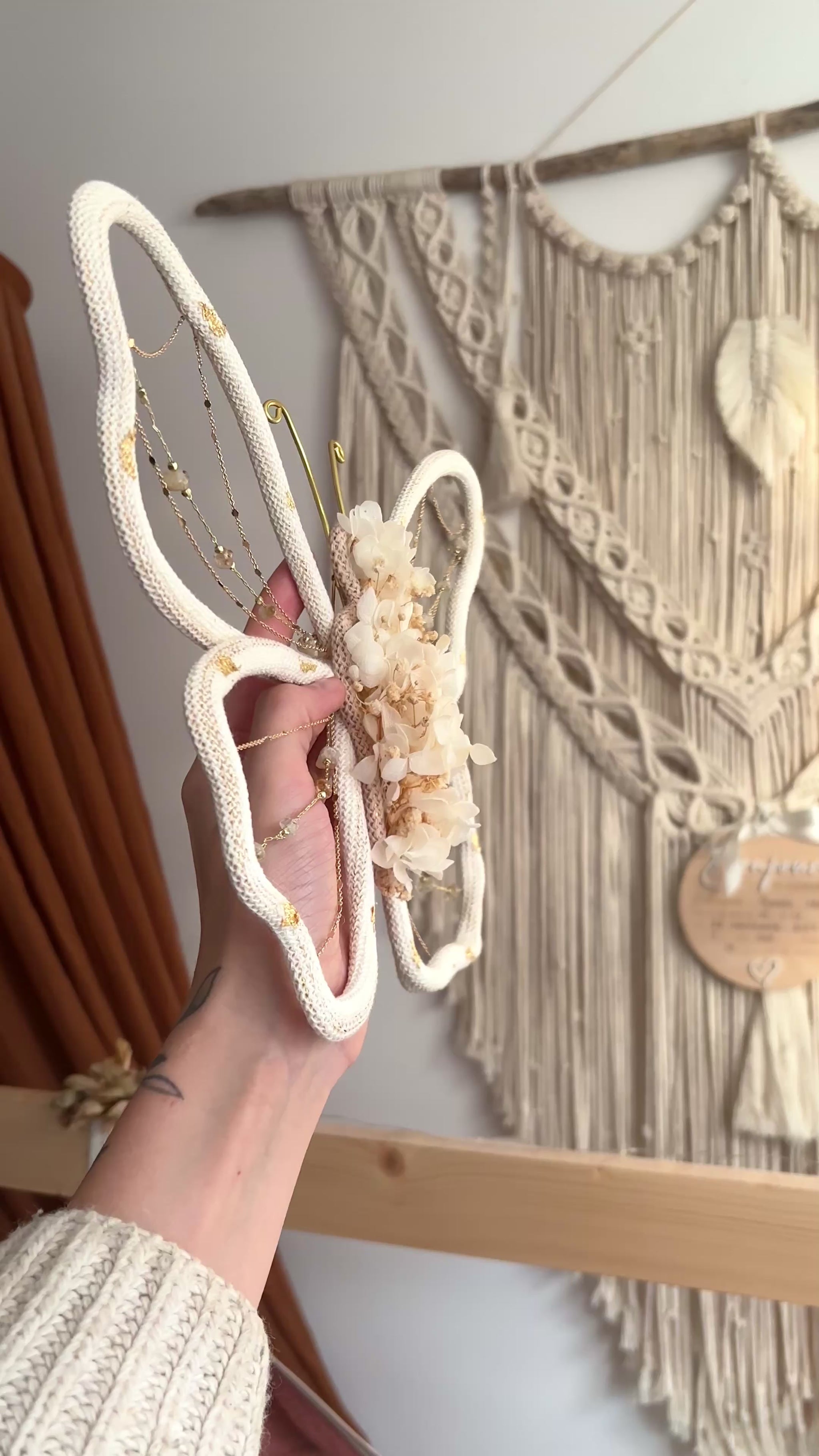 Délicat & lumineux, le papillon Maïra semble tout droit venu d’ailleurs 💫 Façonné entièrement à la main en corde de macramé, il est sublimé par de jomis éclats d’or, de chaînettes dorées & de pierres délicates ✨