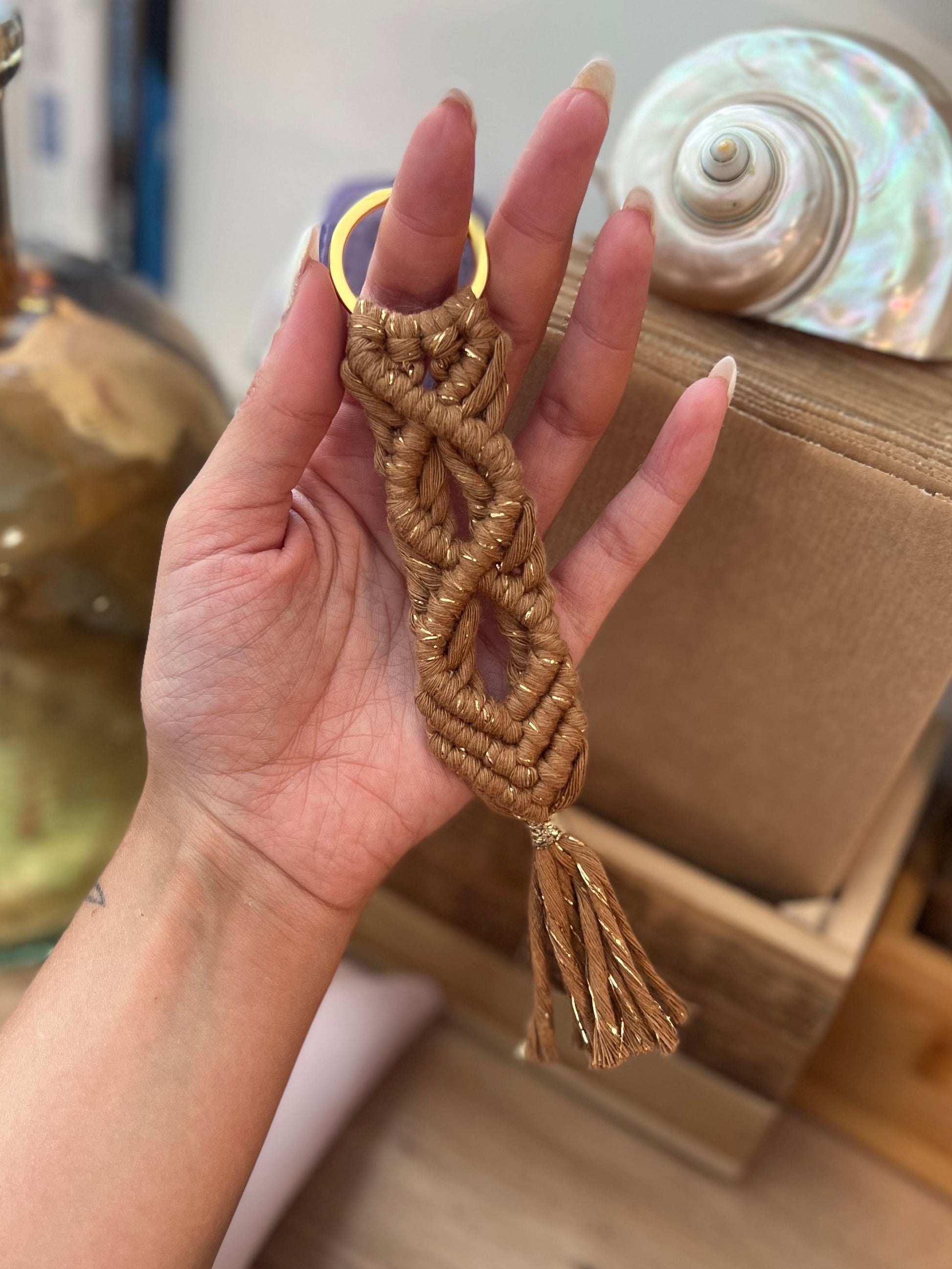 Réalisé avec un fil de coton naturel & une touche dorée, il apporte une note artisanale & raffinée à vos clés, sacs ou trousses 👜